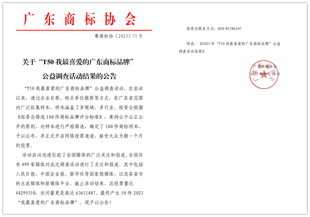 “T50我最喜愛的廣東商標(biāo)品牌”公益調(diào)查活動至今已成功舉辦兩屆,其中,完美、陶陶居、萬和等知名廣東品牌均位列其中,活動啟動迅速引起了全國媒體的廣泛關(guān)注和報道。全國共有499家媒體對此次調(diào)查活動進(jìn)行了關(guān)注和報道。其中包括人民日報、中國企業(yè)報、新華社等國家級媒體,以及各省市的主流媒體和新媒體平臺。截至活動結(jié)束,總投票量達(dá)44299350,訪問量更是高達(dá)63611407。