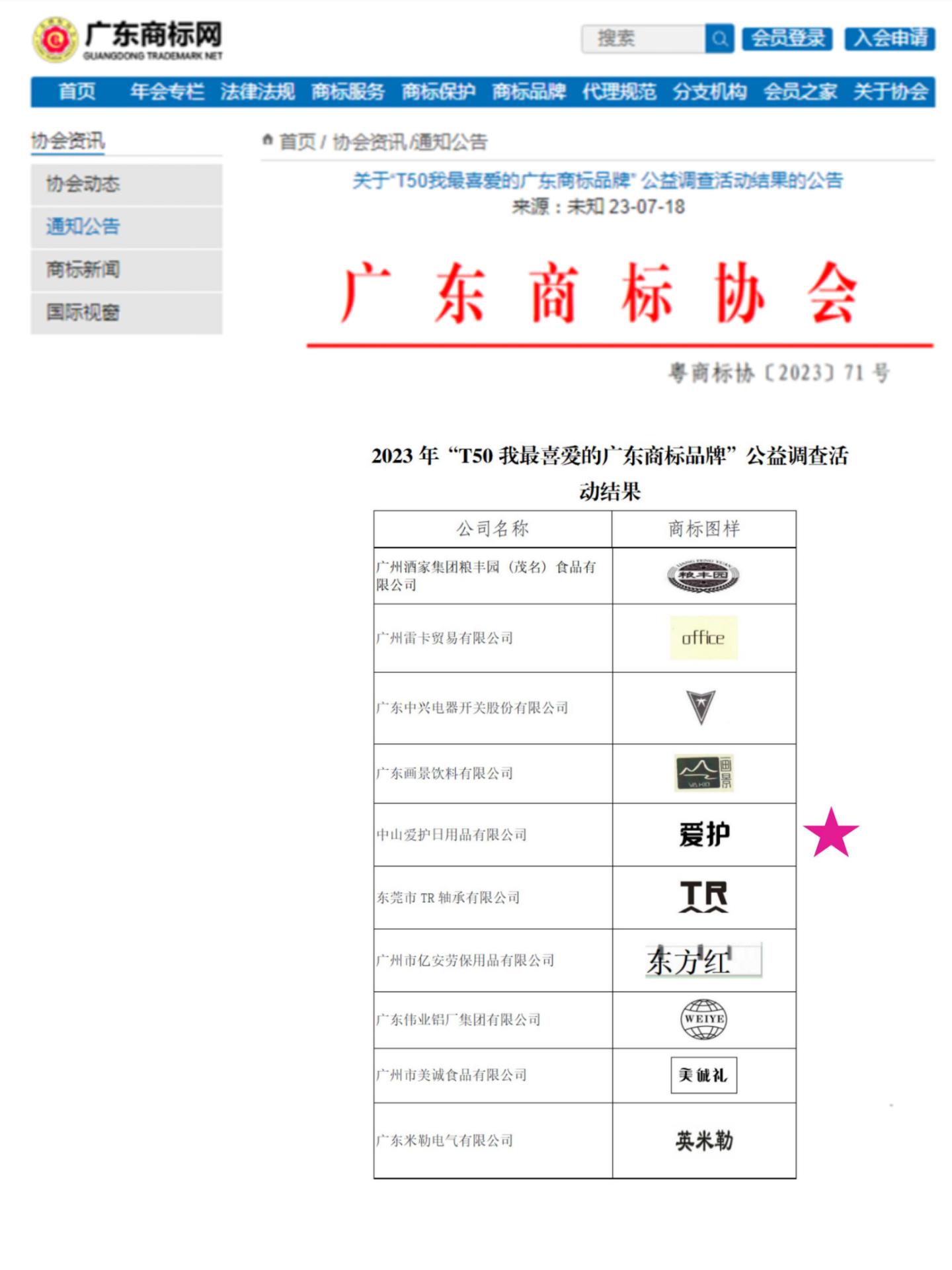 近日,由廣東商標(biāo)協(xié)會聯(lián)合廣東財經(jīng)大學(xué)以及相關(guān)行業(yè)(專業(yè))協(xié)會、市(區(qū))商標(biāo)協(xié)會等單位組織舉辦的“2023我最喜愛的廣東商標(biāo)品牌TOP50”評選排名揭曉。愛護(hù)憑借在行業(yè)領(lǐng)域的美譽度、高知名度和強(qiáng)影響力,在涵蓋了食品、藥品、陶瓷、汽車、農(nóng)業(yè)等眾多行業(yè)領(lǐng)域的廣東商標(biāo)品牌中沖出重圍,以第五名的高票數(shù)成功獲獎,標(biāo)志著市場和消費者對愛護(hù)品牌和產(chǎn)品的高度肯定。